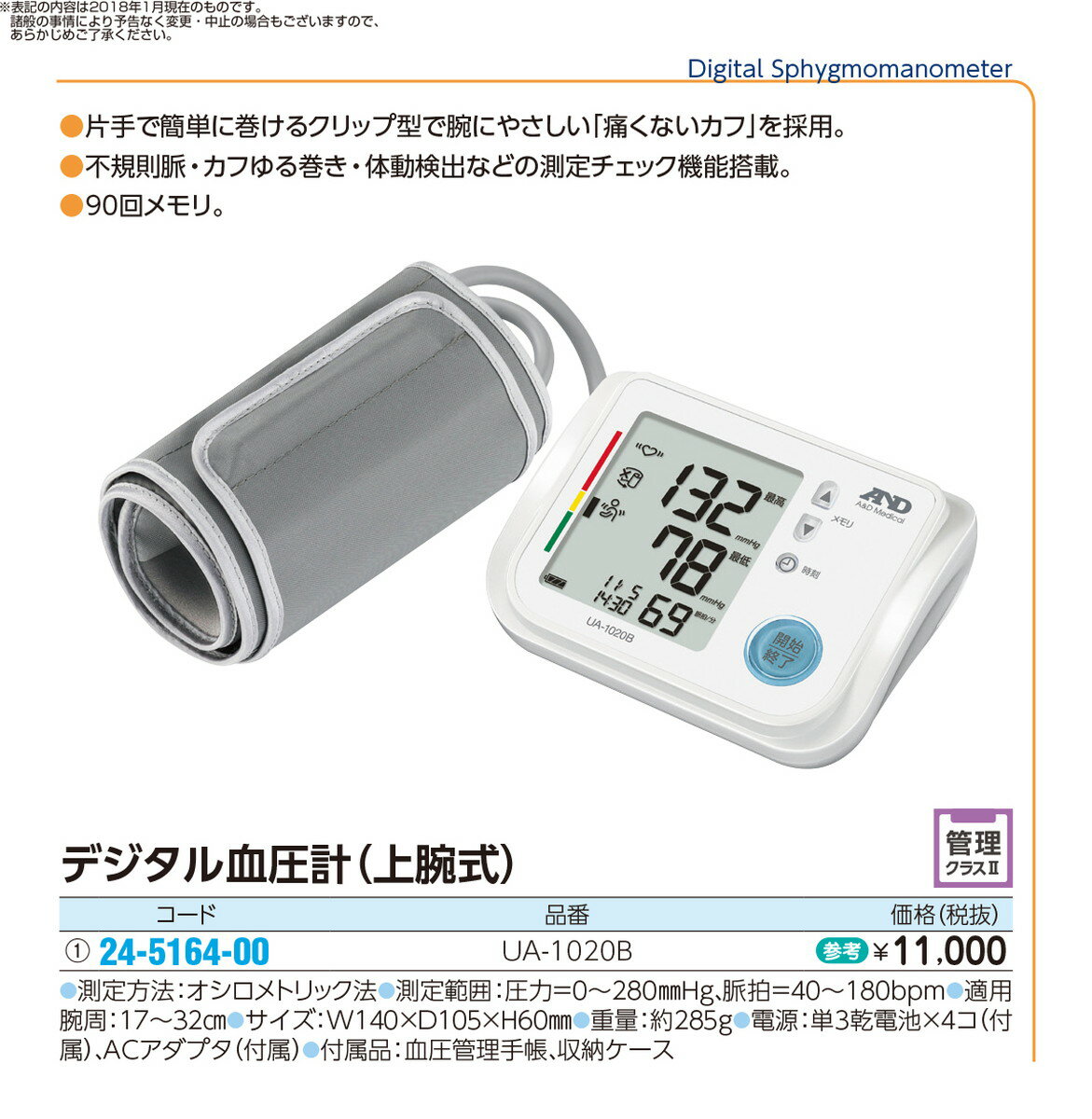 デジタル血圧計(上腕式) UA-1020B品番 24-5164-001入り 管理 診察・診断 診断機器 定価\11000 JAN 4981046021227 ●定価¥11,000円(税別)●商品説明●片手で簡単に巻けるクリップ型で腕にやさしい「痛くないカフ」を採用。