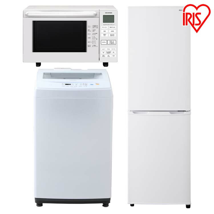 ●セット内容全自動洗濯機 7.0kg IAW-T702ノンフロン冷凍冷蔵庫 162L ホワイトオーブンレンジ 18L ホワイト【全自動洗濯機 7.0kg IAW-T702】(アイリスオーヤマ)●種類:全自動洗濯機●商品サイズ(cm)本体:幅約55.0×奥行約59.1×高さ約93.0ホース込:幅約59.0×奥行約59.1×高さ約93.0●商品重量:約36kg●定格電圧:AC 100V●定格電源周波数:50Hz/60Hz●定格消費電力:50Hz:450W、60Hz:490W●標準洗濯容量:7.0kg●標準脱水容量:7.0kg●標準使用水量:144L●標準水量:54L●防水レベル:IPX4【ノンフロン冷凍冷蔵庫 162L ホワイト】(アイリスオーヤマ)●種類:ノンフロン冷凍冷蔵庫●冷媒:R600a●ドア数:2●商品サイズ(cm):幅約47.4×奥行約53.5×高さ約149.6●質量:約40kg●定格電源:AC100V(50Hz/60Hz)●定格消費電力(50Hz/60Hz)電動機:68/74W、電熱装置:6W●定格内容積※1:全体162L(冷蔵室100L/冷凍室62L)●冷凍室の性能※2記号:フォースター冷凍負荷温度(食品温度):-18℃以下冷凍食品の保存期間の目安:約3か月●ドア開閉方向:右●電源コード:約1.55m※1定格内容積は、日本工業規格(JISC9801:2015)にもとづき、食品収納スペースと冷気循環スペースを含んでいます。