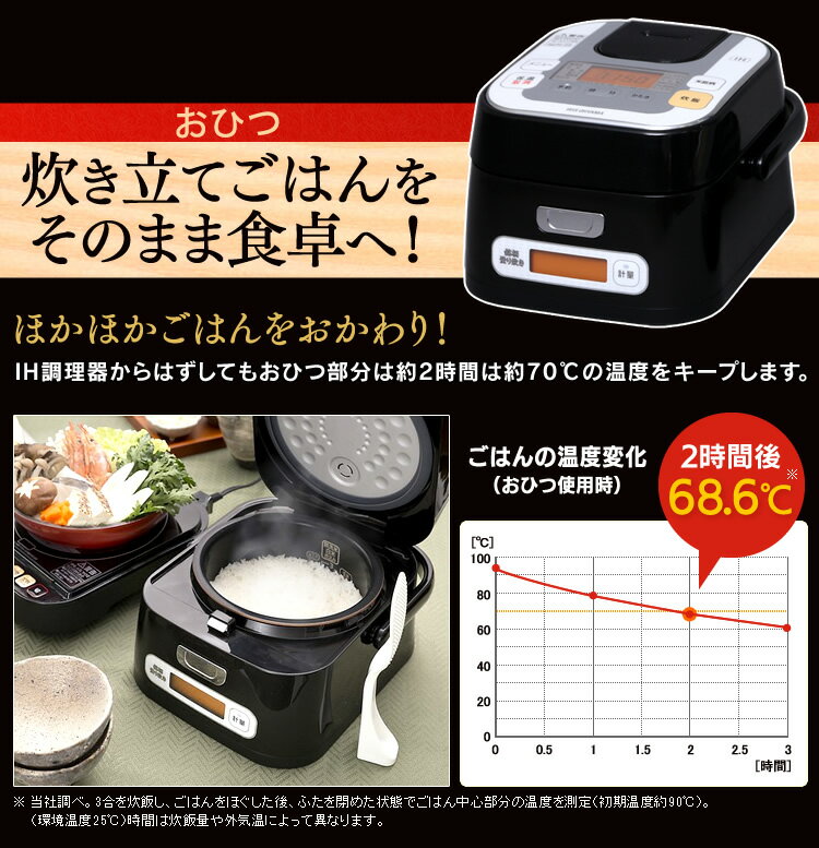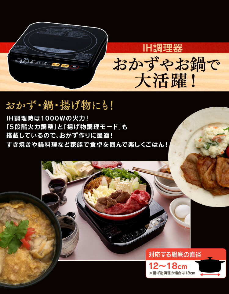 【IH調理器】●電源AC100V(50/60Hz)●消費電力1000W●火力調節加熱調理:5段階(火力)約80W相当〜約1000W揚げ物調理:5段階(油温)約160〜約200℃●付属品蒸しプレート:原料/ポリプロピレン、耐熱温度/120℃しゃもじ:原料/ポリプロピレン、耐熱温度/120℃計量カップ:原料/ポリプロピレン、耐熱温度/120℃、容量/白米用(180ml)、無洗米用(171ml)★